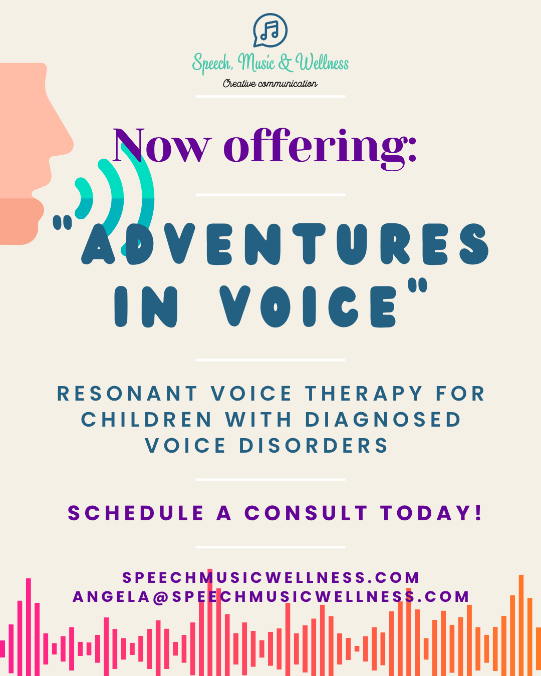 We are now offering “Adventures in Voice”! This is a Resonant Voice Therapy program designed for children who are diagnosed with Voice Disorders. The program is derived from the Lessac-Madsen Resonant Voice Therapy program created by Dr. Kittie Verdolini-Abbott, PhD, CCC-SLP, but is completely tailored to teach your child how to produce and sustain healthy voice production throughout their daily lives.